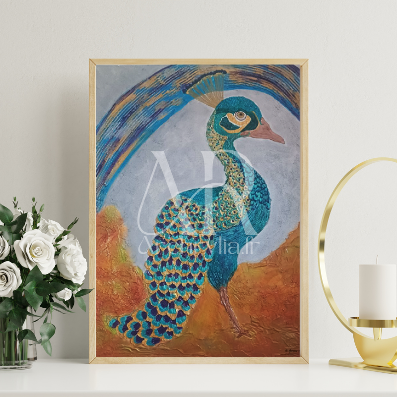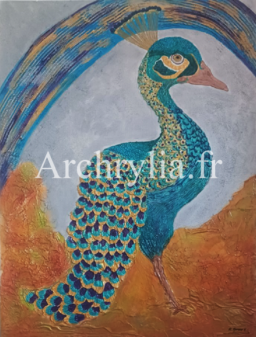 Symbole de paix et d’harmonie, oiseau intégralement réalisé en enduit de plâtre étalé au couteau, recouvert de couleurs irisées.