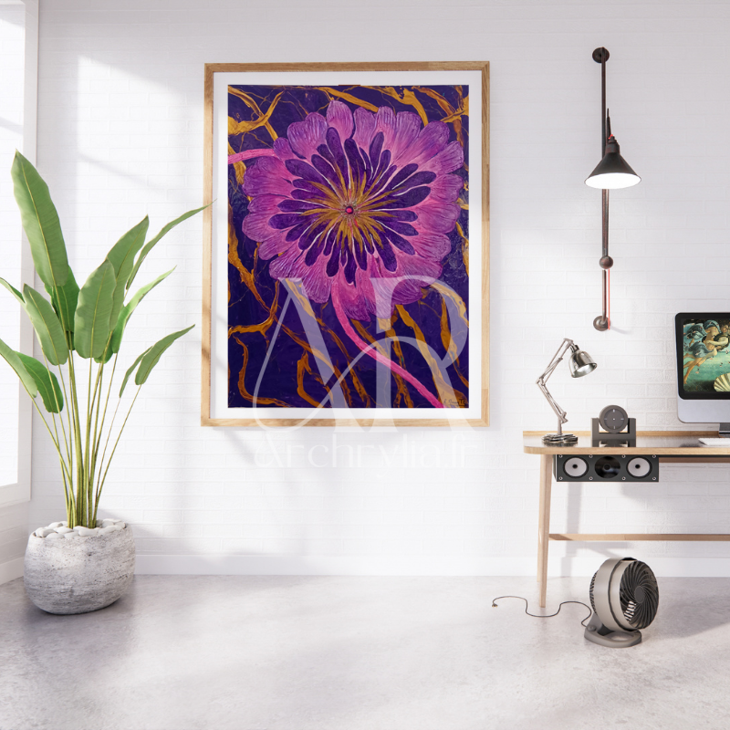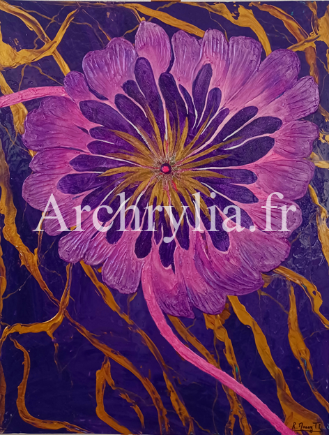 Couleur dominante associée à la royauté et à la créativité. Fleur matérialisée par le soufflé au tuba par superpostion de pigments, ainsi qu’ en enduit de plâtre.